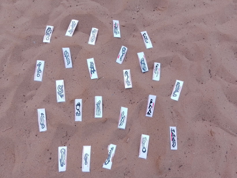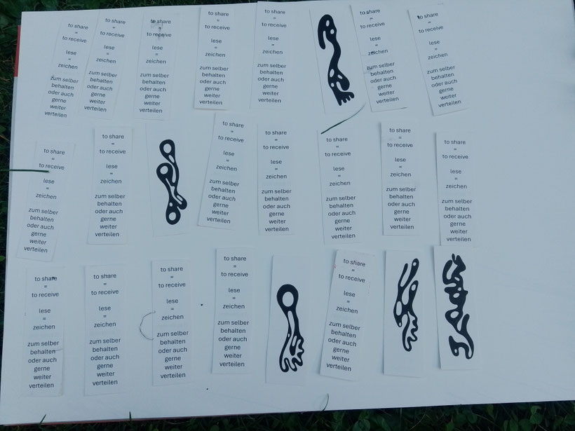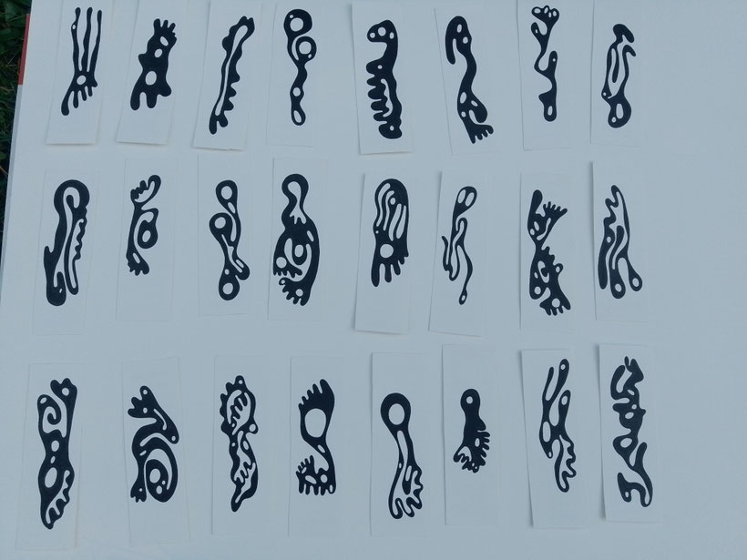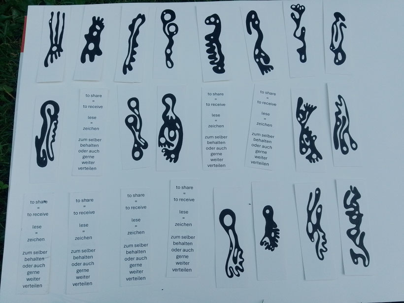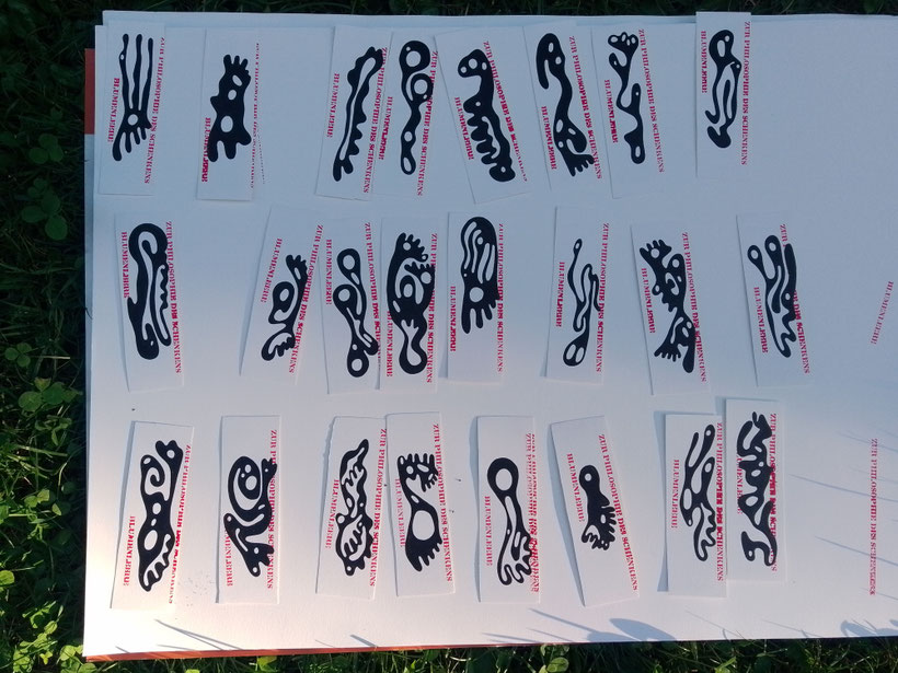 24 lese=zeichen, welche ich ueber die dem vorhergegange woche gestaltet habe - vorderseite je mit anderem motiv, schwarze tusche, pinsel, papier; bestempelt (blumenleere; zur philosophie des