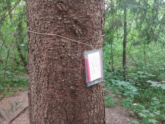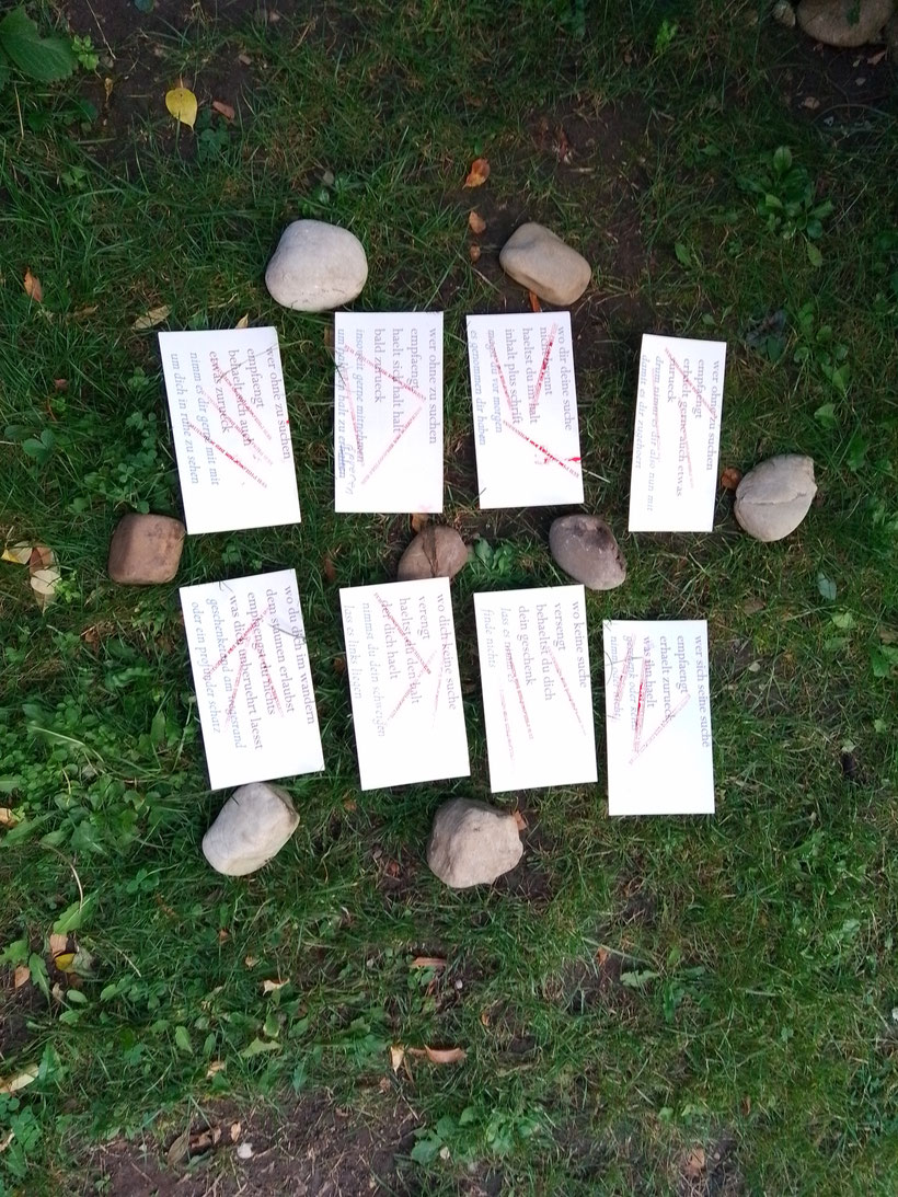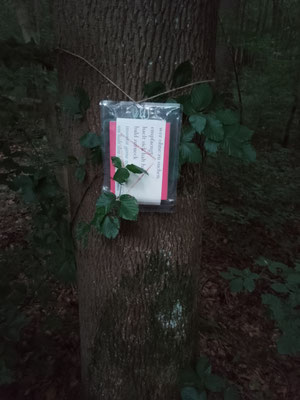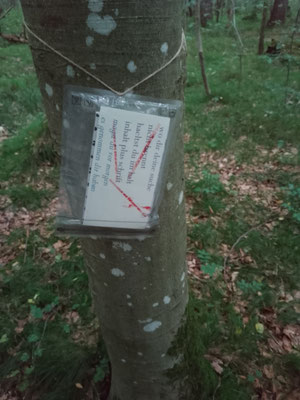 in durchsichtige, wasserdichte zipbeutel implementiert, welche ich via bastschnur im siebentischwald in augsburg an acht verschiedenen baeumen befestige: & wer sie finde, ohne zu suchen,