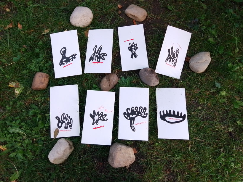 schwarzer tusche & pinsel verwendend, bemale ich die rueckseiten von 8 ausgeschnittenen zetteln, worauf die varationen eines zum mitnehmen einladen sollenden, soziale hemmschwellen